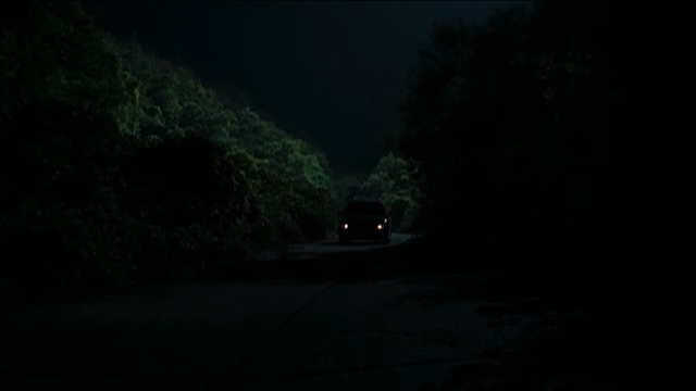 울창한 숲으로 둘러싸인 도로를 달리는 자동차