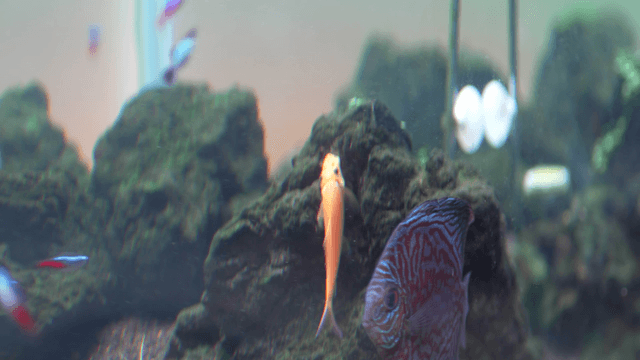 수족관 바닥에서 먹이를 먹는 작은 물고기들