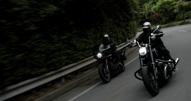 나무가 늘어선 길에서 오토바이를 타고 출발하는 운전자