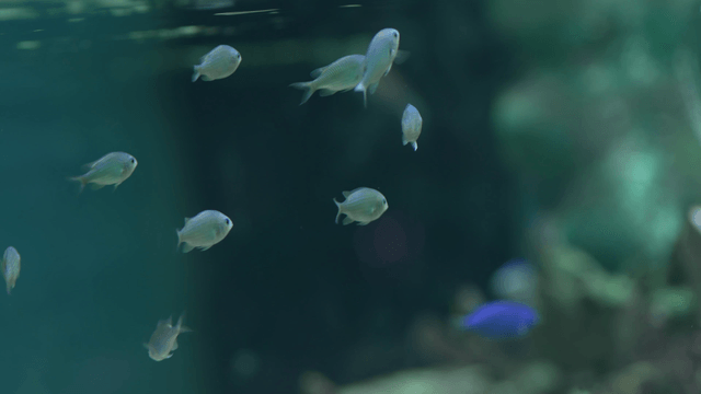 수족관 바닥에서 먹이를 먹는 작은 물고기들