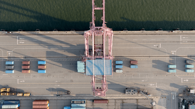 분주한 항구에서 컨테이너를 적재하는 장면