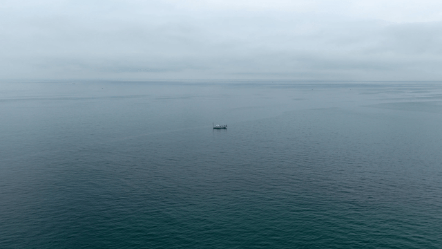 갈매기와 함께 잔잔한 바다를 항해하는 배