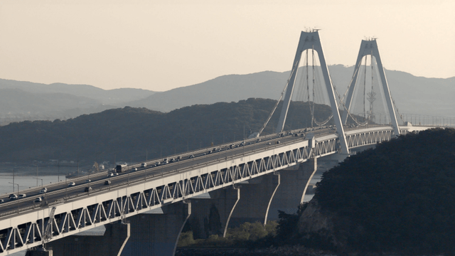 한강을 가로지르기 위해 다리를 달리는 차량들