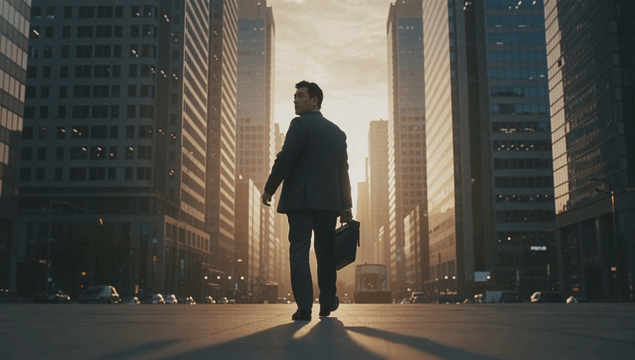 해질녘 높은 빌딩 사이를 걷는 직장인 남자의 뒷모습