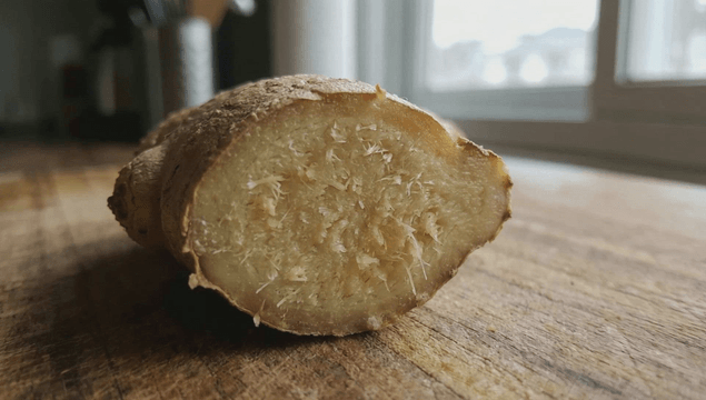 나무 도마 위의 신선한 생강 뿌리