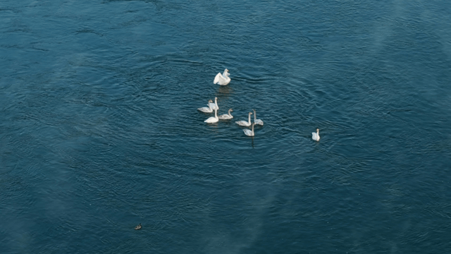 밤의 호수 위를 헤엄치는 백조 두 마리
