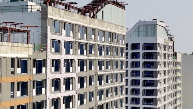 건설 현장 골조 위에서 케이블을 설치하는 작업자들