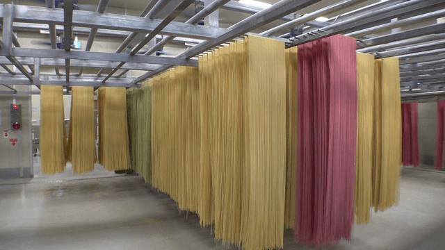 공장에서 노란 장갑을 끼고 콩나물을 다루는 작업자