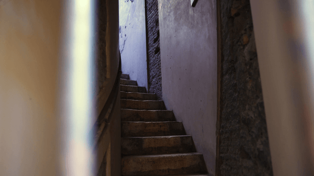 건물 복도의 어두운 조명 속 실내 계단을 내려가는 사람