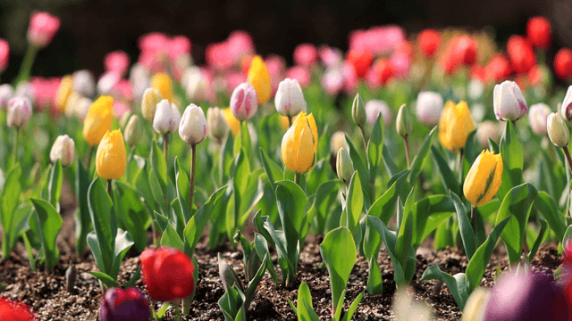 다채로운 튤립이 줄지어 있는 화단