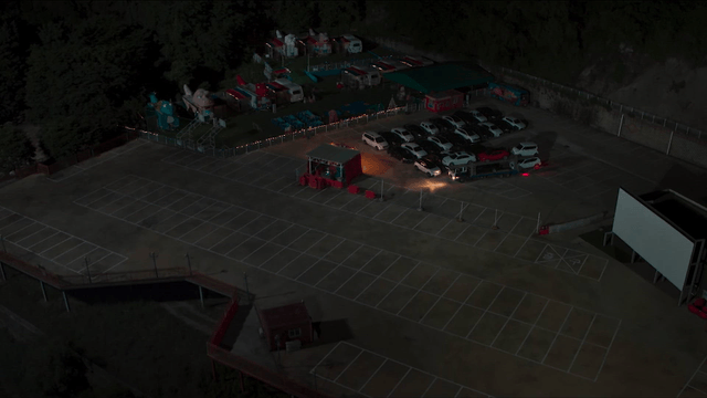 어두운 폐차장 사무실에서 나오는 여성과 빨간 차