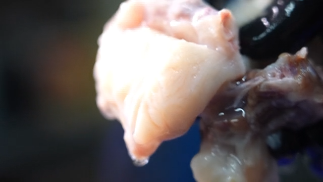 신선한 붉은 참치살을 숟가락으로 손질하는 모습