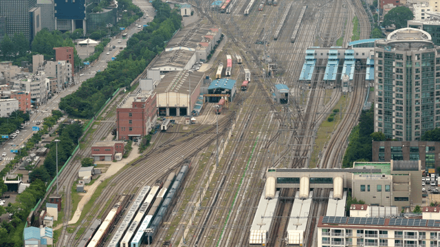 기차역에서 태양광 패널 옆을 지나가는 기차