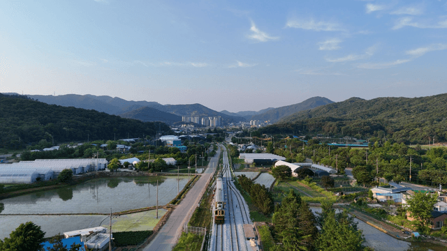 기차 창문에 맺힌 빗방울과 흐릿한 시골 풍경