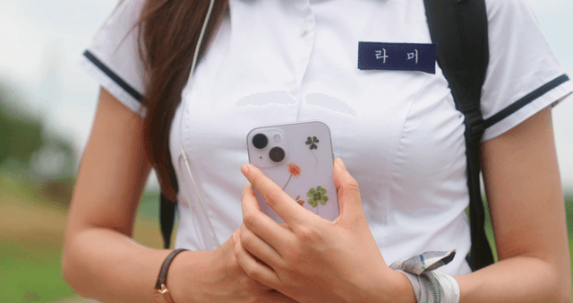 학교 복도에서 스마트폰을 보며 걷는 여학생
