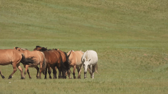 햇빛이 드는 드넓은 목초지에서 풀을 뜯는 말들