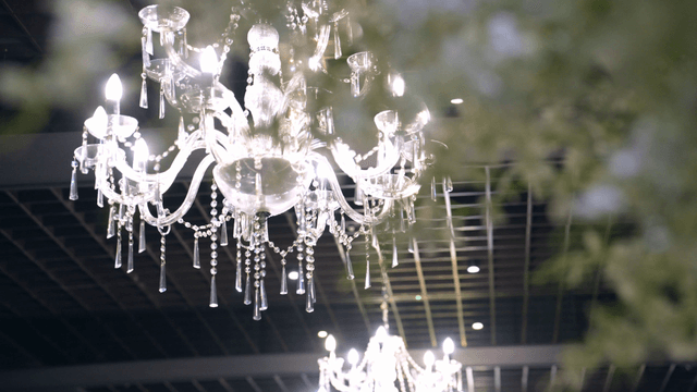 실내 샹들리에와 걸린 식물