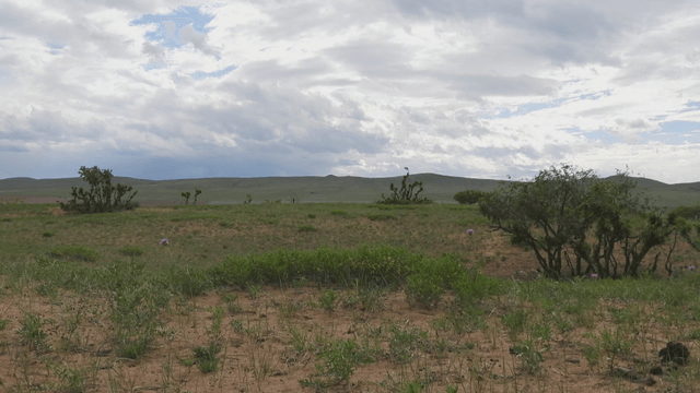 구름 낀 하늘 아래 넓은 초원