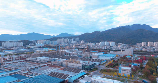 구름 낀 하늘 아래 광활한 산업 도시 풍경