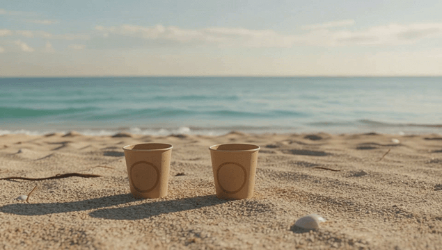 모래사장 위 두 개의 종이컵