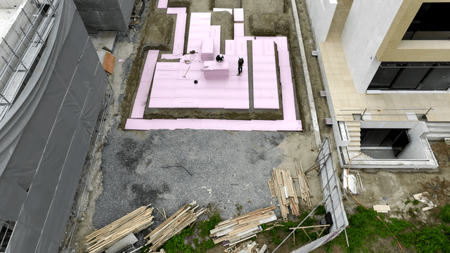 건설 현장에서 단열재를 깔고 있는 작업자들