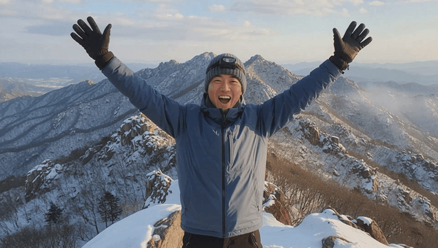 눈 덮인 산 정상에서 만세하며 기뻐하는 등산객
