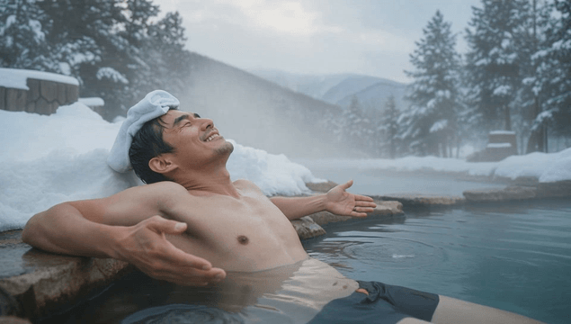 눈 덮인 산을 배경으로 온천에서 휴식을 취하는 남성