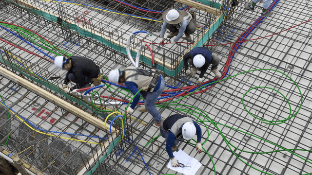 건설 현장에서 케이블 설치 중인 작업자들