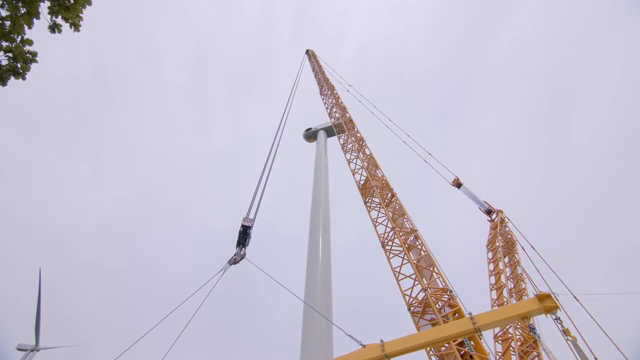 숲 속에서의 크레인을 사용한 풍력 터빈 건설 현장