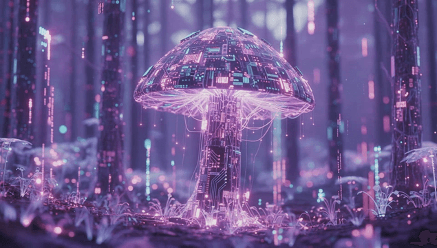 숲속에서 빛나는 디지털 버섯