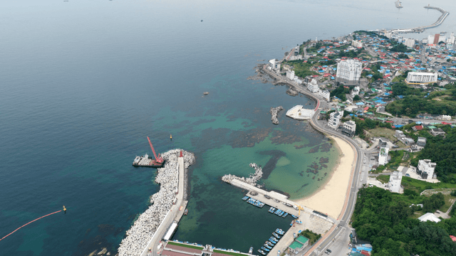 해안 도로와 작은 항구의 보트