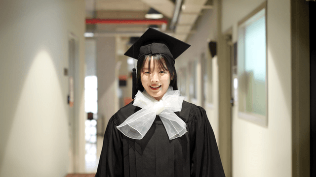 졸업 가운을 입고 웃고 있는 졸업생