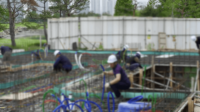 철제 건설 재료들과 작업자들이 있는 작업현장