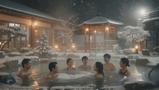 눈 내리는 밤 온천을 즐기는 사람들