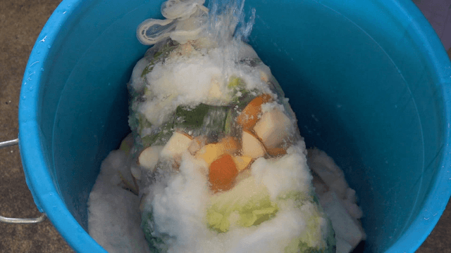 채소와 식용 곤충이 들어간 냄비에 물 붓기
