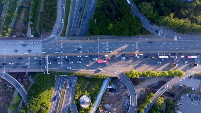 도시 고층 건물들이 멀리 보이는 번잡한 고속도로