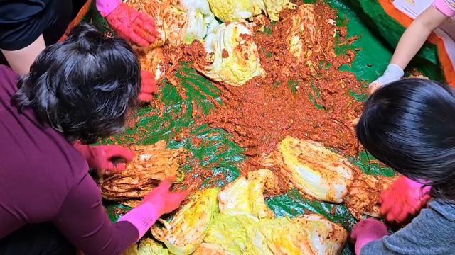 배추에 고추 양념을 넣어 김치를 만드는 모습