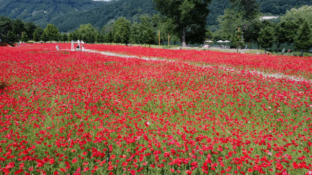 맑은 하늘 아래 붉은 양귀비 꽃밭