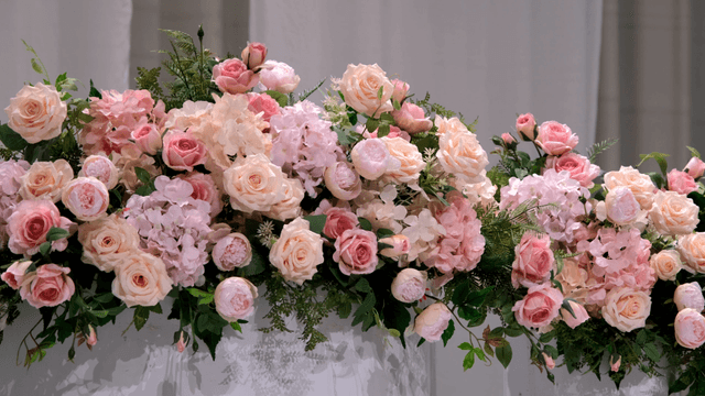 만발한 분홍색 꽃과 아름다운 산을 배경으로 울창한 숲