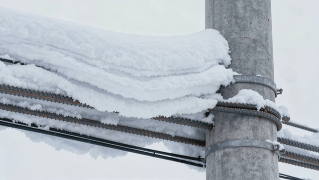 눈으로 덮인 전신주와 전선