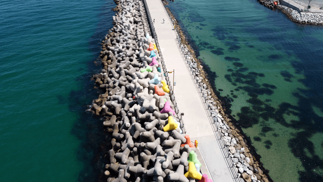 바다 옆에 있는 형형색색의 테트라포드가 있는 방파제