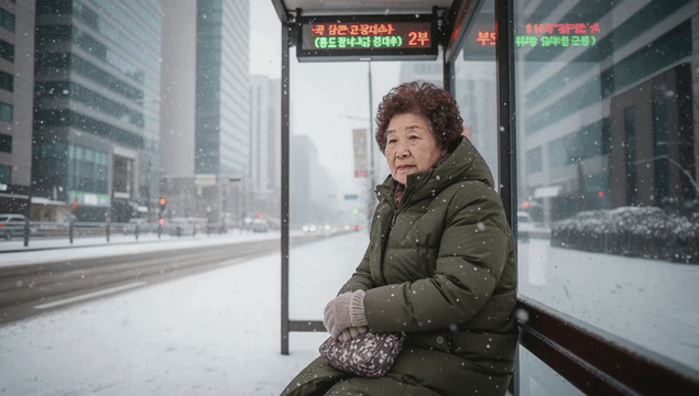 커피를 들고 버스 정류장에서 기다리는 직장인 여성