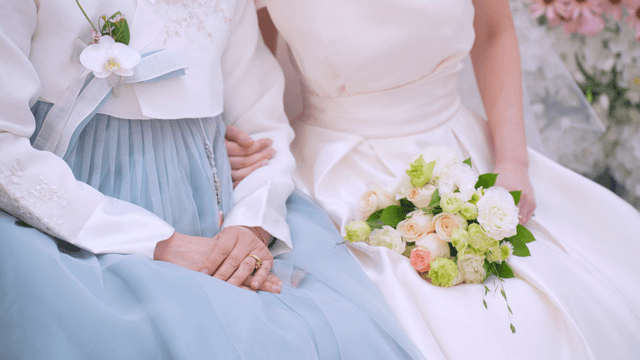 웨딩드레스를 입은 신부와 한복을 입은 어머니