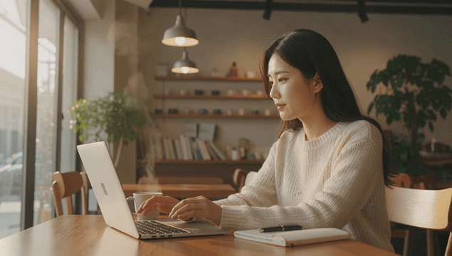 아늑한 카페에서 노트북으로 작업하는 여성