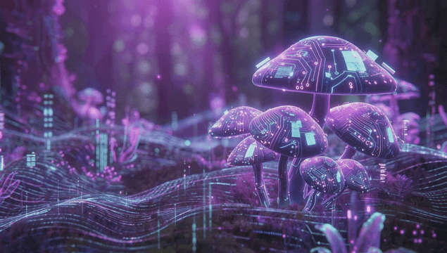 숲 속의 빛나는 디지털 버섯