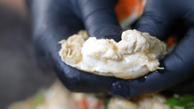 장갑 낀 손으로 갓 튀겨진 게살 튀김의 속을 보여주는 모습