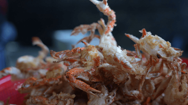 그릇에 담긴 튀긴 게와 짜장면