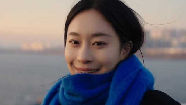 파란 목도리를 한 여성이 정면을 보고 미소짓는 모습