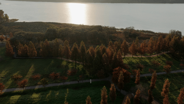 알록달록한 나무가 있는 고요한 호숫가 공원