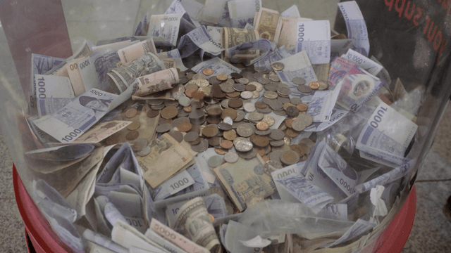 다양한 화폐로 가득 찬 기부 상자